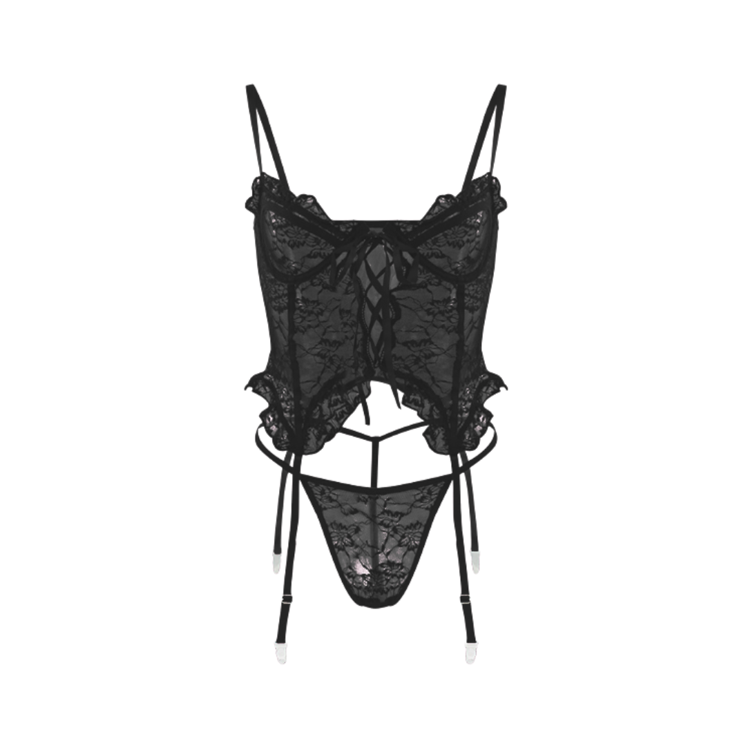 Meet the Marisol Bustier Set in Black, seductive, sleek, and made to mesmerise. The intricate floral lace pairs with a bold lace-up front to create a look that’s equal parts sultry and sophisticated. Its lightweight stretch structure shapes beautifully while offering comfort, and the matching g-string keeps the silhouette clean and enticing. Finished with adjustable suspender straps and matching stockings, this set is designed for nights when you want to make a statement.
