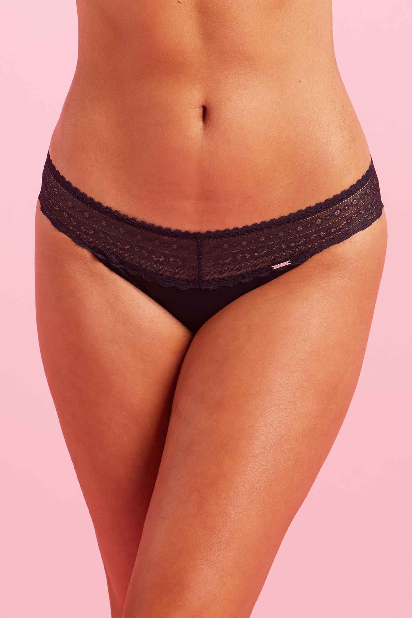 Experience everyday luxury with a touch of eco-consciousness in our black bikini briefs. Crafted with meticulous attention to detail, this flattering mid-rise style is made from a harmonious blend of reclaimed cotton and recycled polyester. The fabric boasts a supremely soft texture for unparalleled comfort all day long. The geometric lace waistband adds a dash of sophistication, while the delicate elastic leg trim ensures a flawless fit.