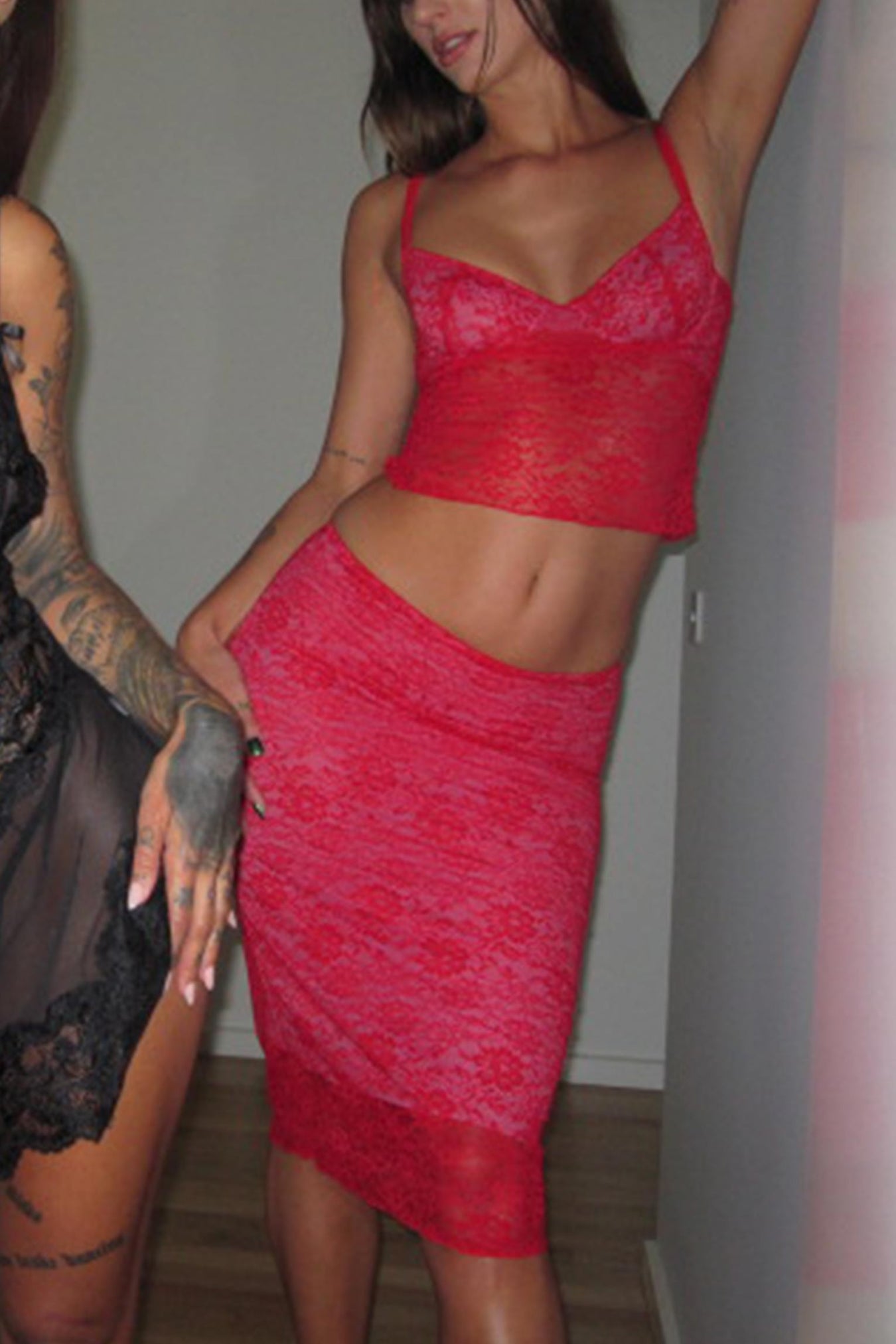The Valentina midi skirt and cami set is designed to make you feel your most beautiful. We've paired her striking red lace with a delicate pink lining, for a truly one-of-a-kind romantic charm.