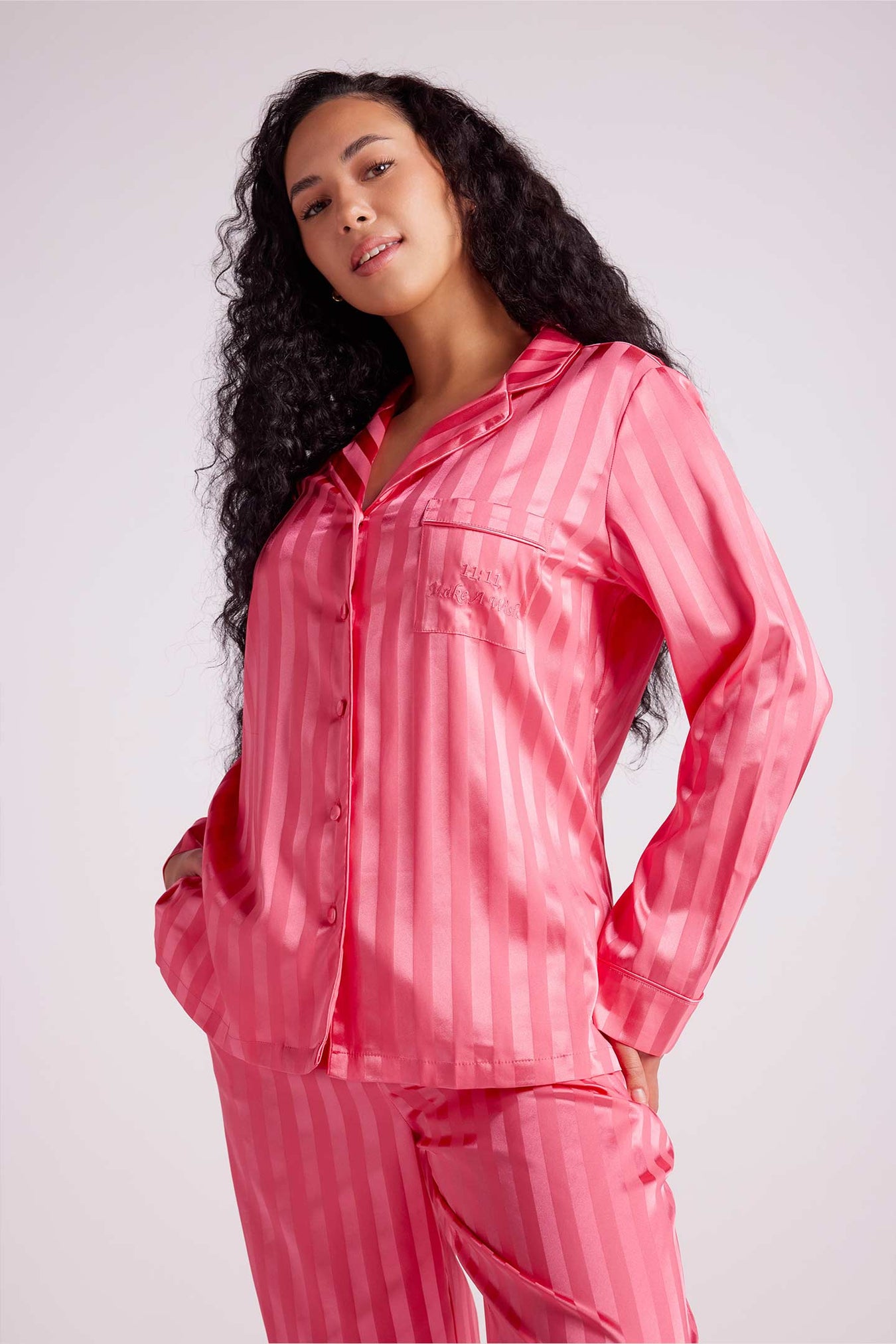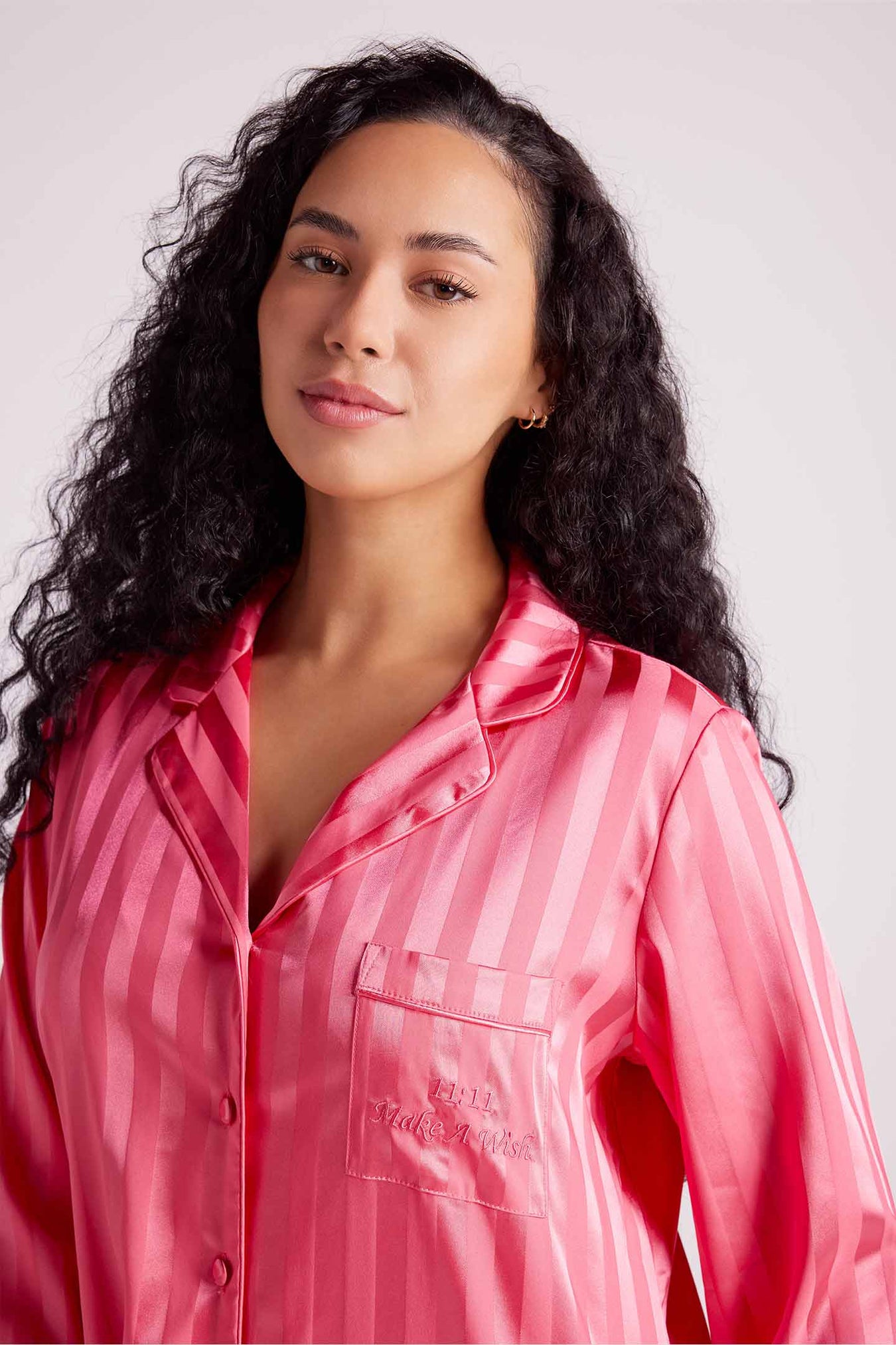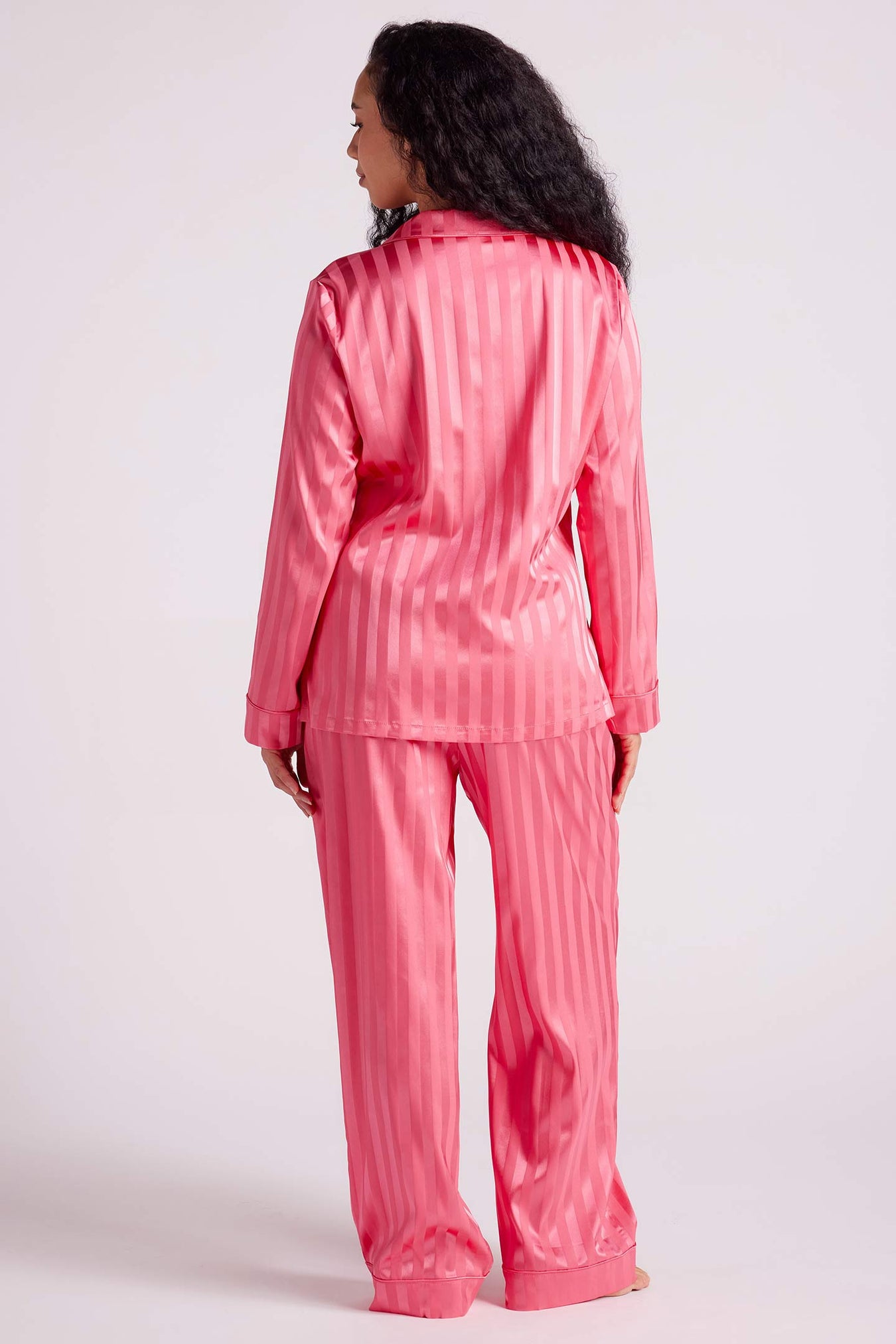 Indulge in the sophistication of our satin pyjama set. Crafted from luxuriously soft fabric in a relaxed fit it offers an elegant look. This set is a relaxed fit ensuring a silhouette that's both flattering and comfortable. Whether you're kickstarting your day or settling in for the night, immerse yourself in the chic comfort only satin can provide.
